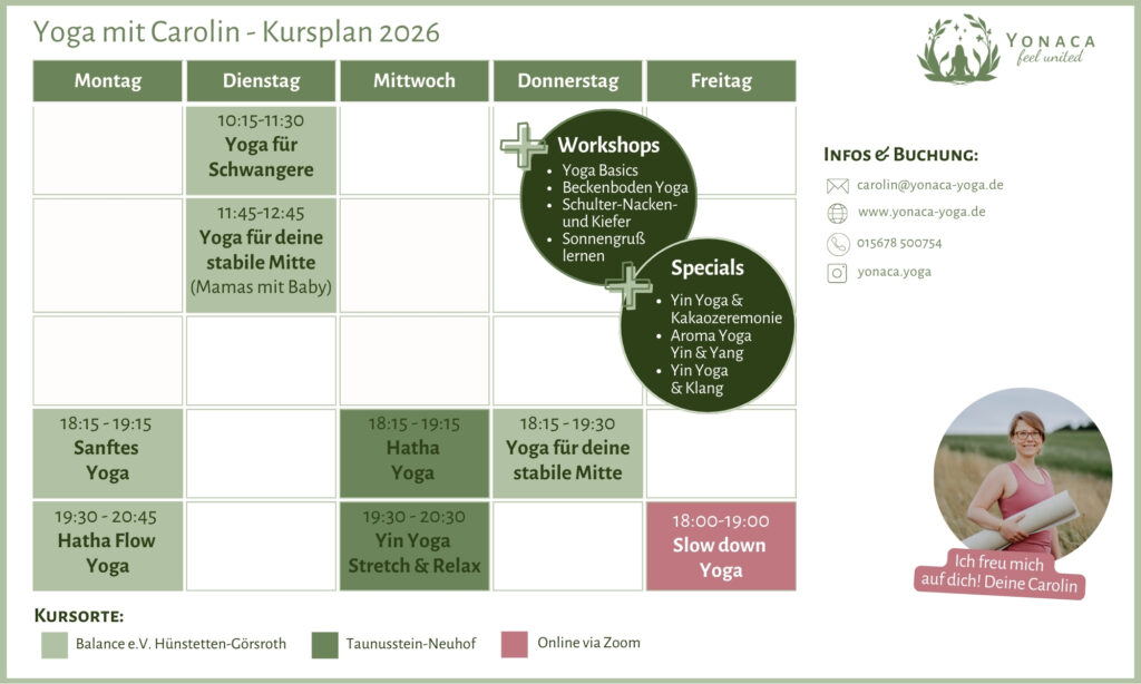 - Bitte mitbringen: eigene Yoga-/Sportmatte und wetterangepasste Kleidung im Zwiebellook. An manchen Veranstaltungsorten sind Matten vorhanden, bitte bei der Anmeldung prüfen.
